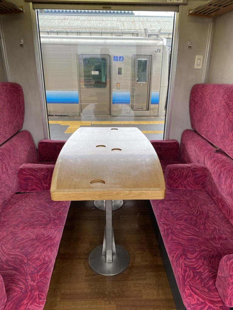 私は牛めしをそこで食べて、のんびりと時間を過ごしました。せっかくなので、空いているリゾートしらかみのボックス席を見学したり、座席を眺めさせてもらいましたよ。